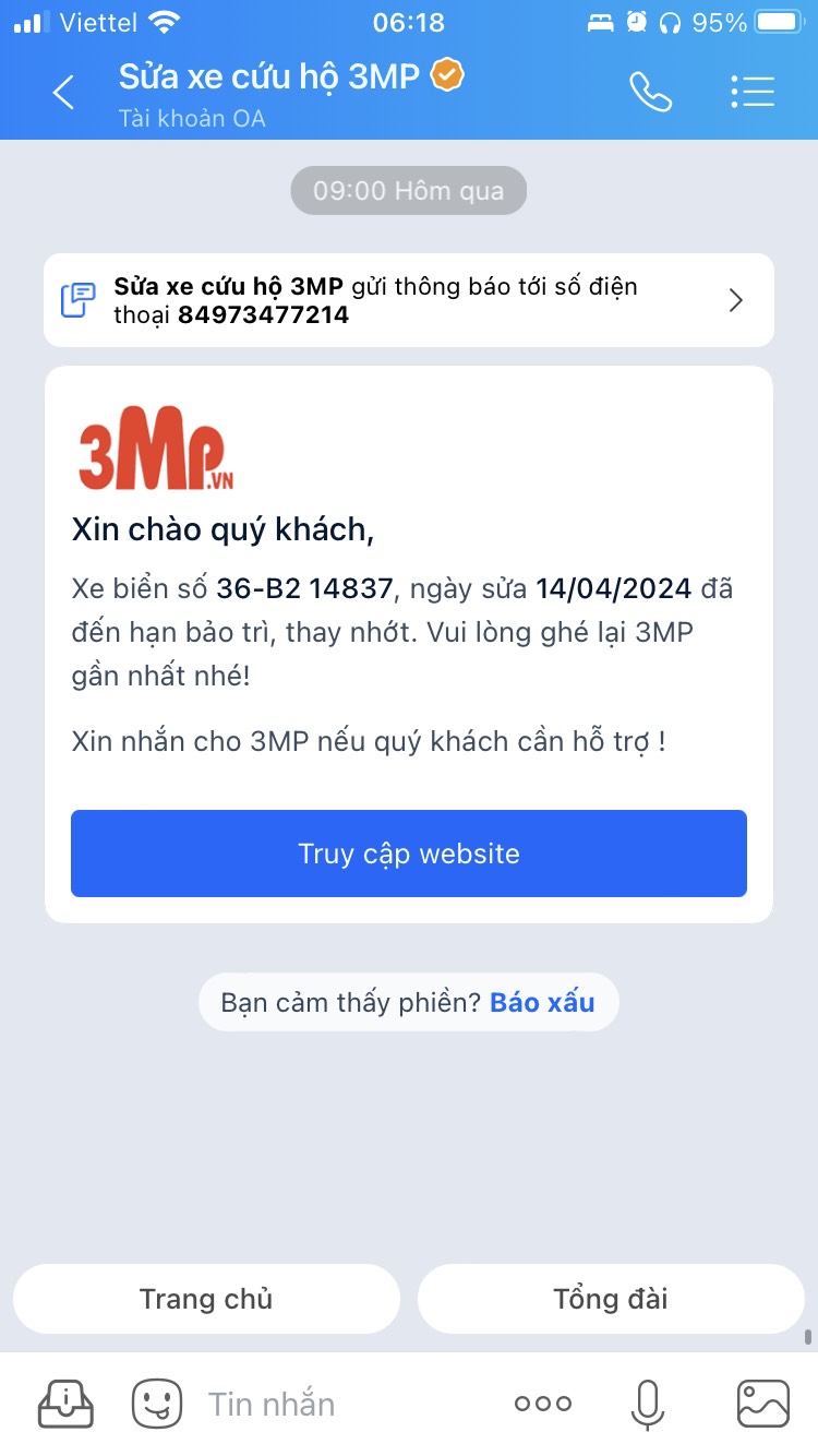 Hệ thống nhắn tin nhắc nhở thay nhớt tại 3MP