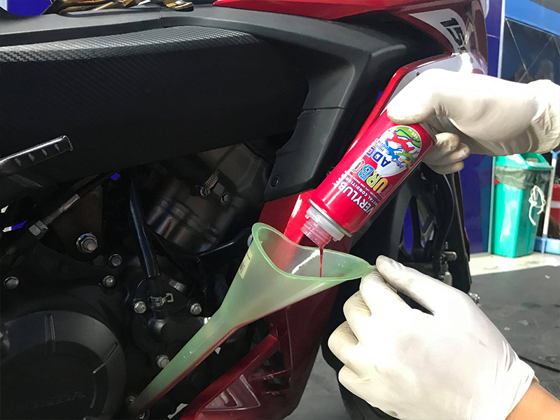 - Khởi động động cơ và để xe chạy trong vài phút để phụ gia hòa tan hoàn toàn.