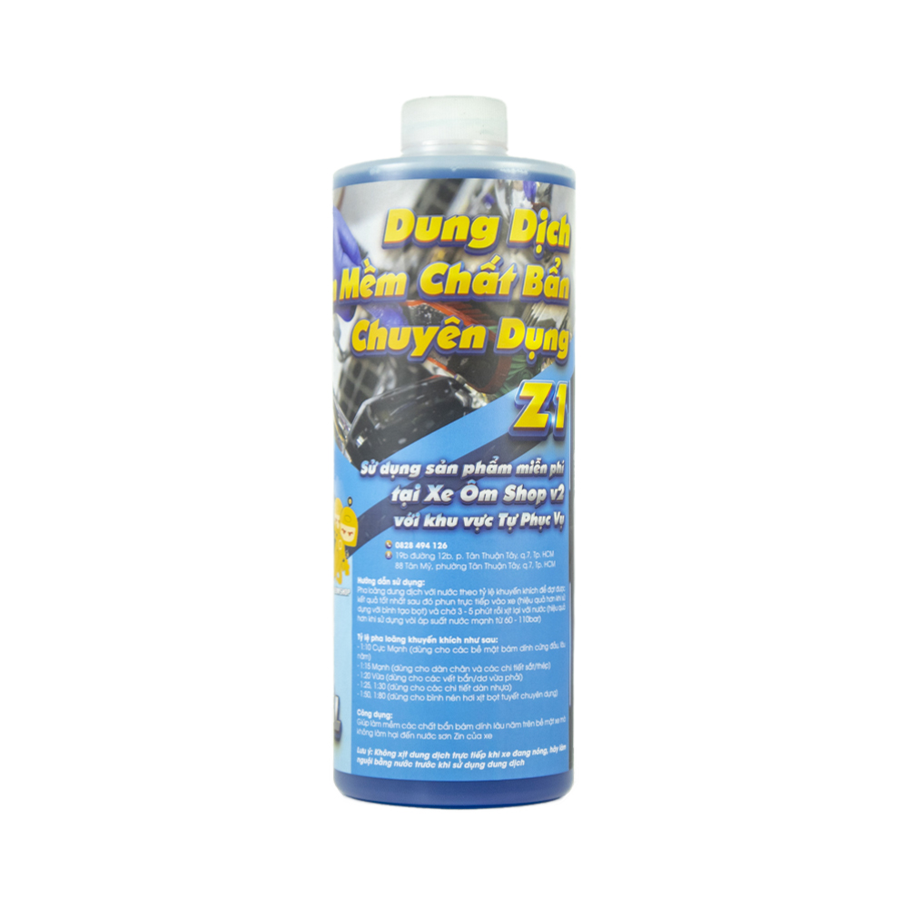 Dung dịch tẩy rửa xe máy Z1 là dung dịch chuyên dụng để tẩy rửa các vết bẩn cứng đầu trên xe máy như vết gỉ sét, vết dầu mỡ, … Dung dịch này có tác dụng mạnh hơn dung dịch nước rửa xe máy và có thể làm ảnh hưởng đến lớp sơn xe nếu sử dụng không đúng cách.